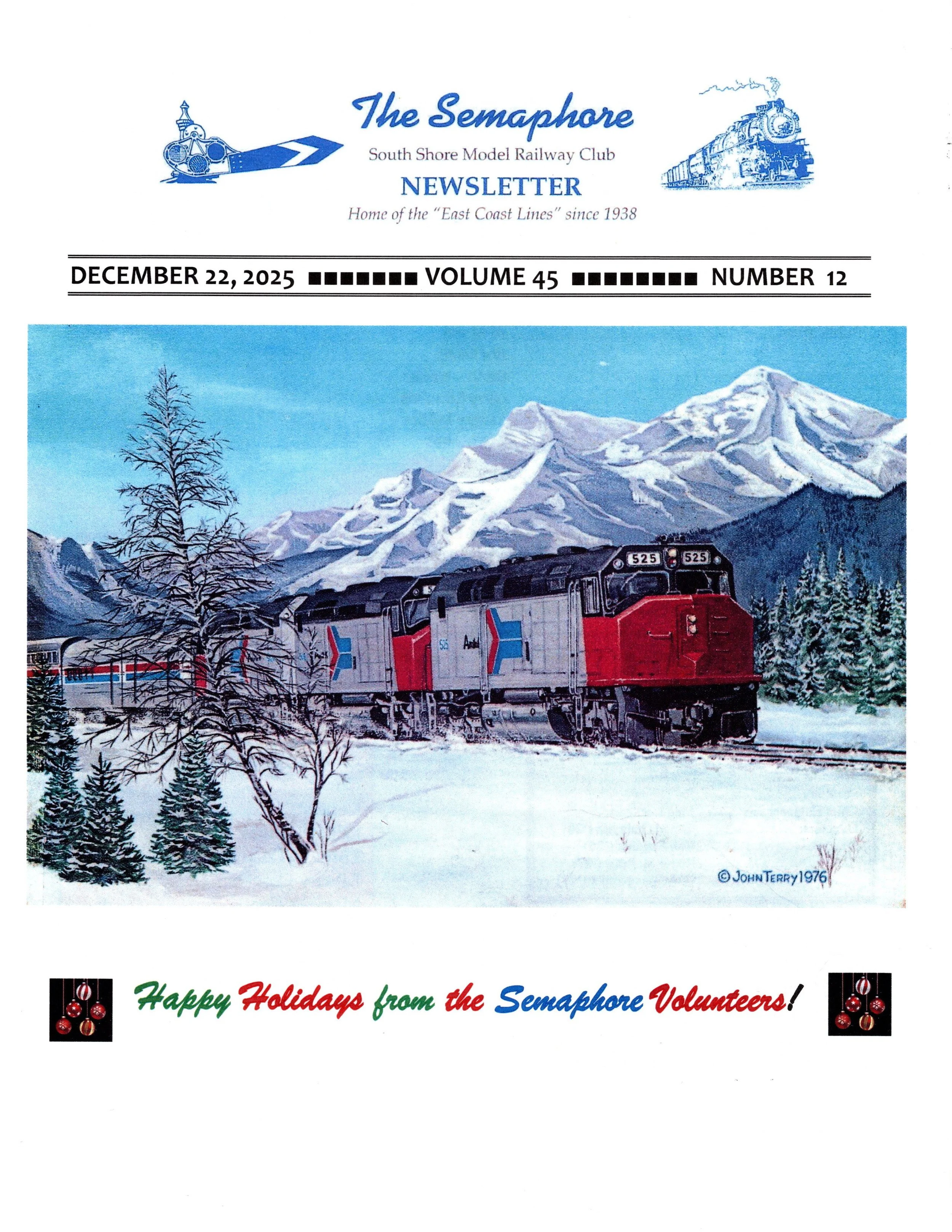 Our Club newsletter, “The Semaphore”, is published monthly, except for July. It contains Club news and articles pertaining to railroading, railroads and models, as well as the occasional review of products and train travel report.